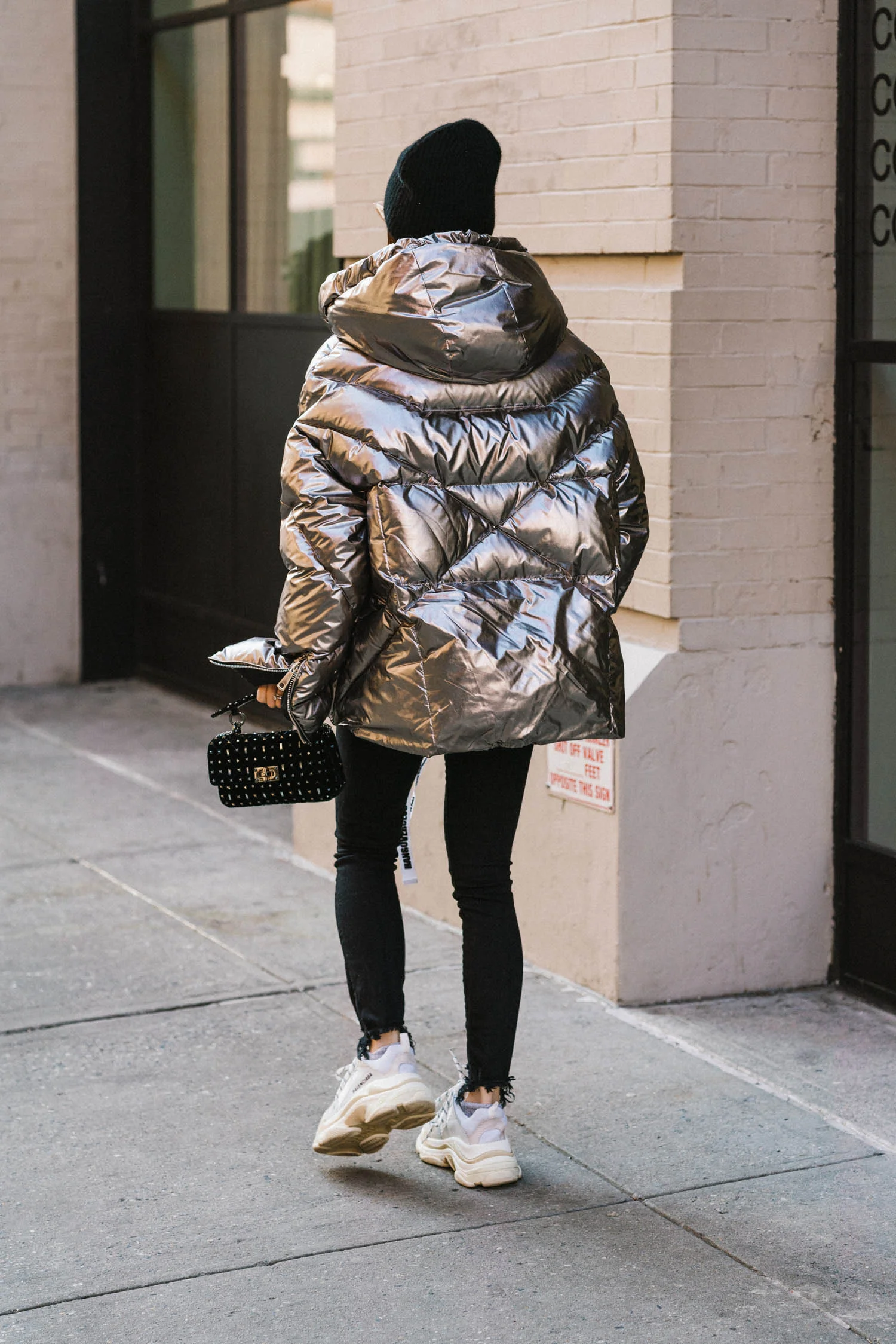 Khrisjoy Jacket, Dries Van Noten Top, Balenciaga Sneakers, Valentino Bag, Celine Sunglasses, COS Beanie