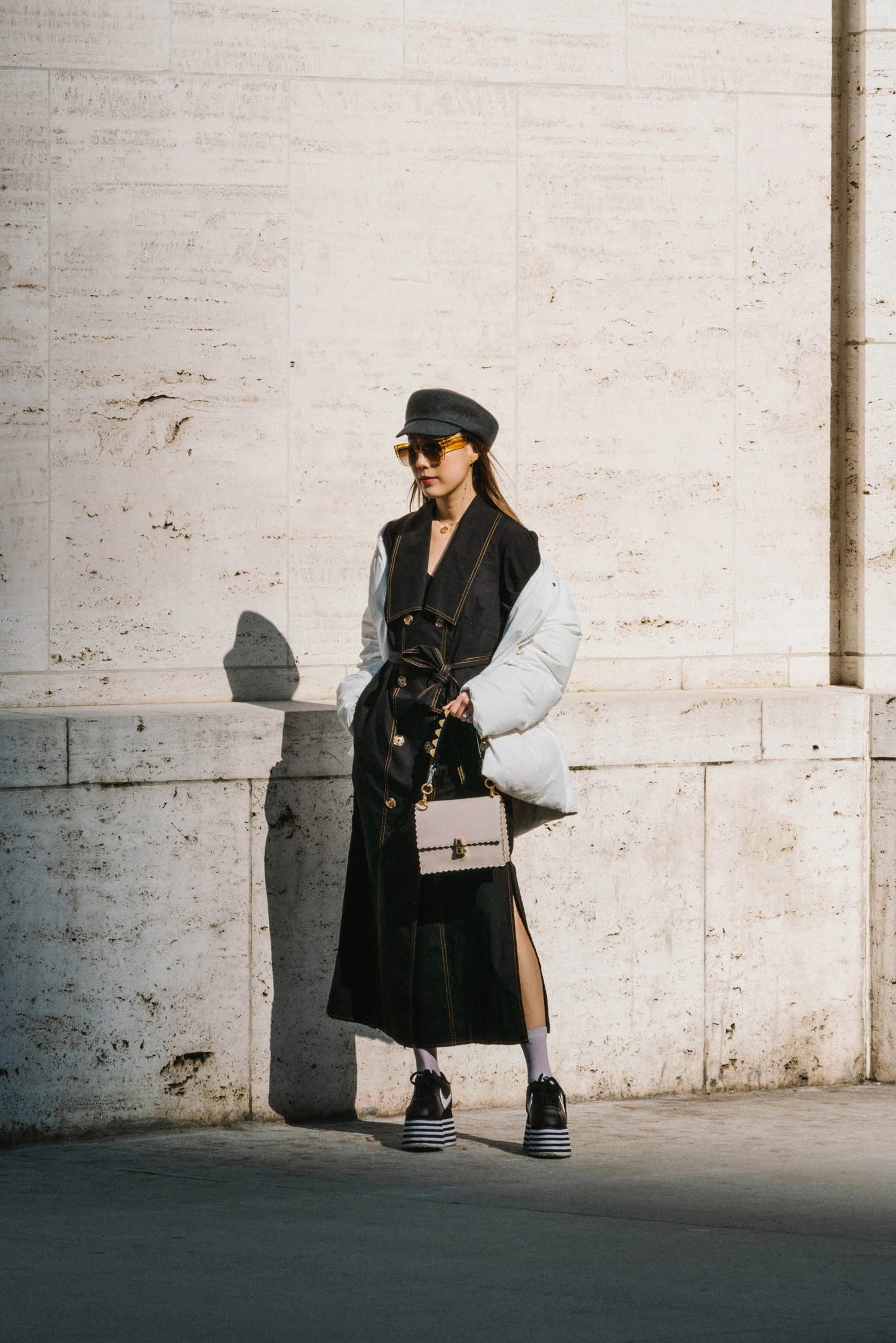 Erdem Coat, Sézane Dress, Valentino Boots, Chanel Bag, Celine Sunglasses, Miu Miu Headband, WWAKE Earrings, Louis Vuitton Necklace, Cartier Necklace