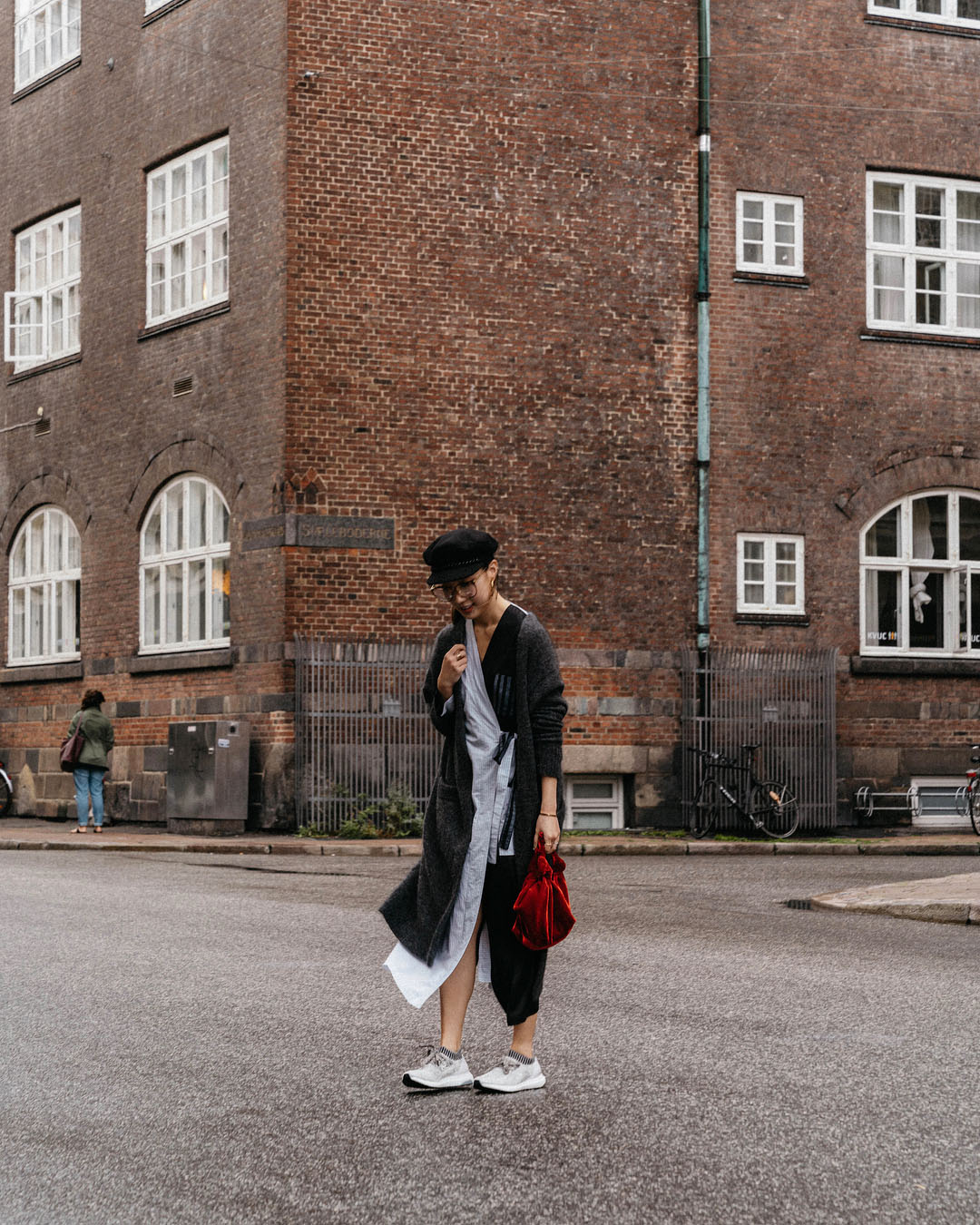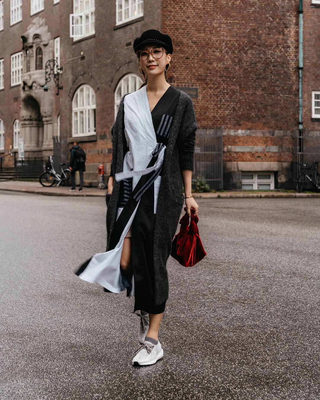 Acne Studios Cardigan, MM6 Dress, adidas Sneakers, The Row Bag, Eugenia Kim Hat, Linda Farrow Glasses
