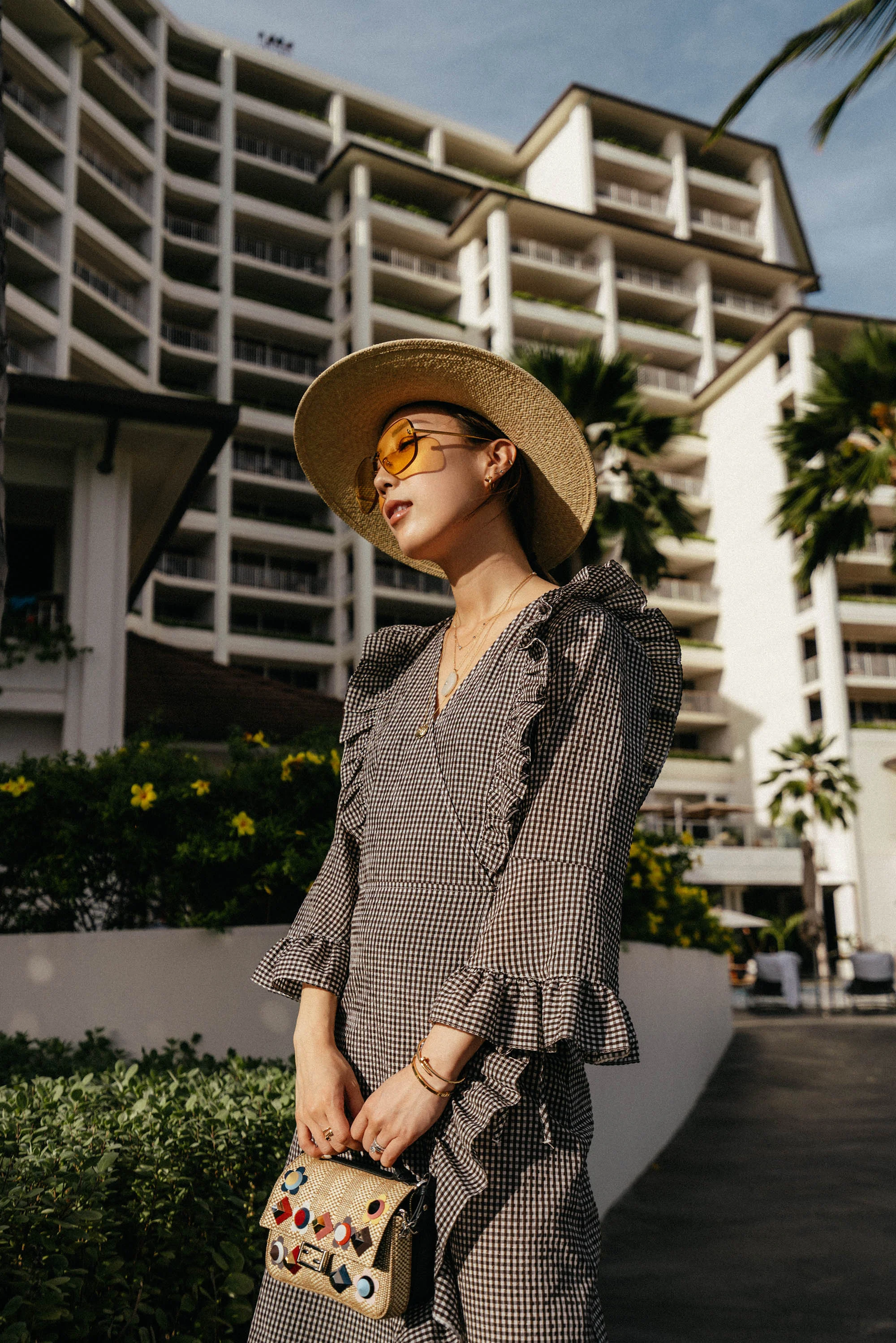 Ganni Dress, Seven All Around Sandals, Fendi Bag, Janessa Leone Hat, Gucci Sunglasses