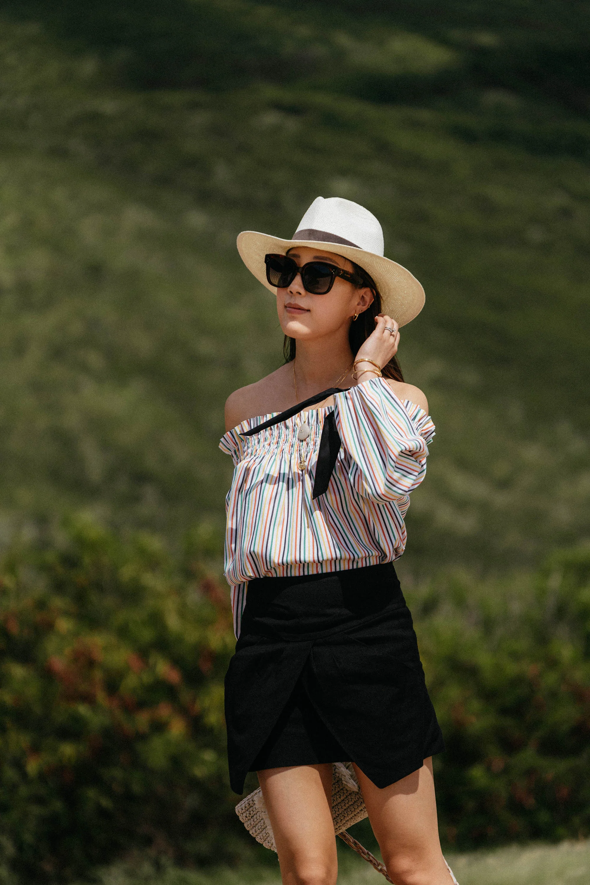 Caroline Constas Top, Isabel Marant Skirt, Celine Sunglasses, Seven All Around Sandals, Carolina Santo Domingo Bag, Janessa Leone Hat