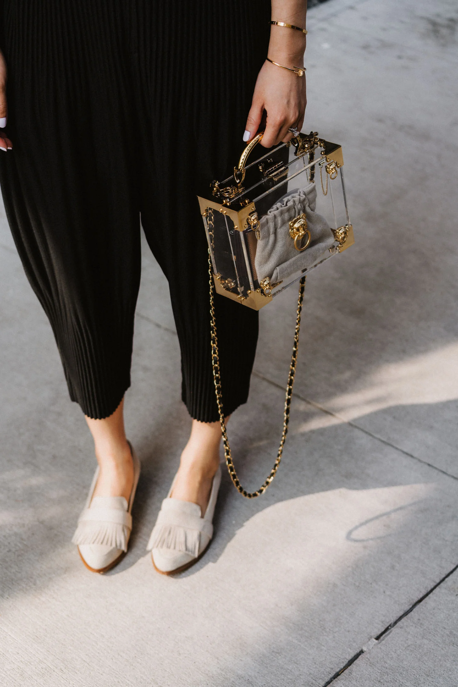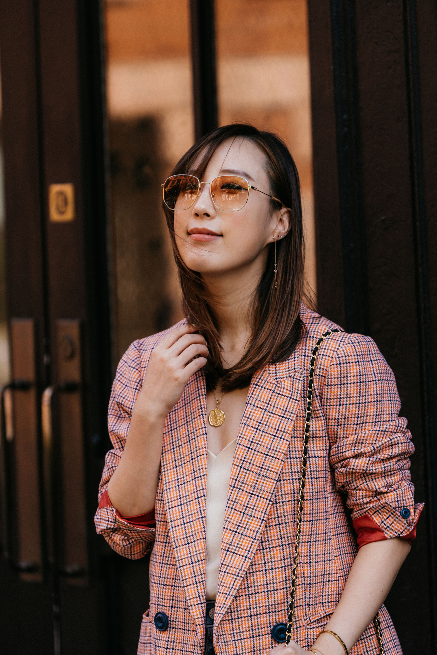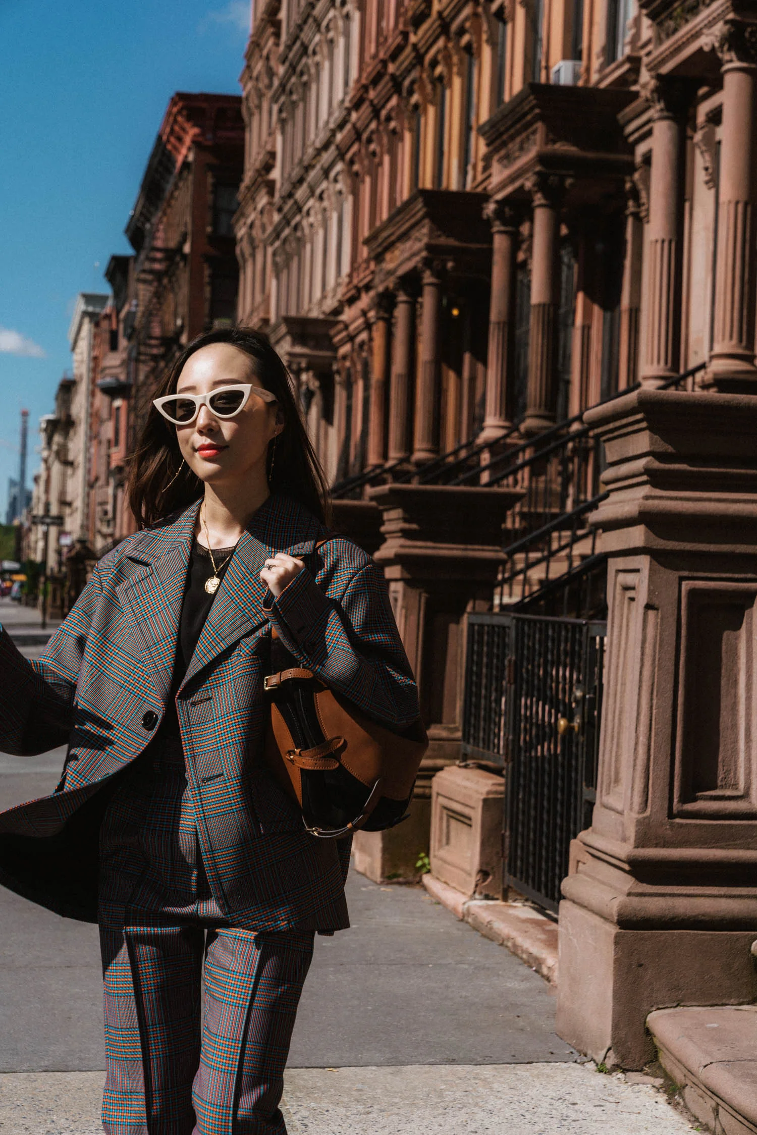 ICONS Objects of Desire Blazer, The Row Top, Trave Denim, Aspinal of London Bag, Gucci Sunglasses, Azlee Necklace, WWAKE Earrings