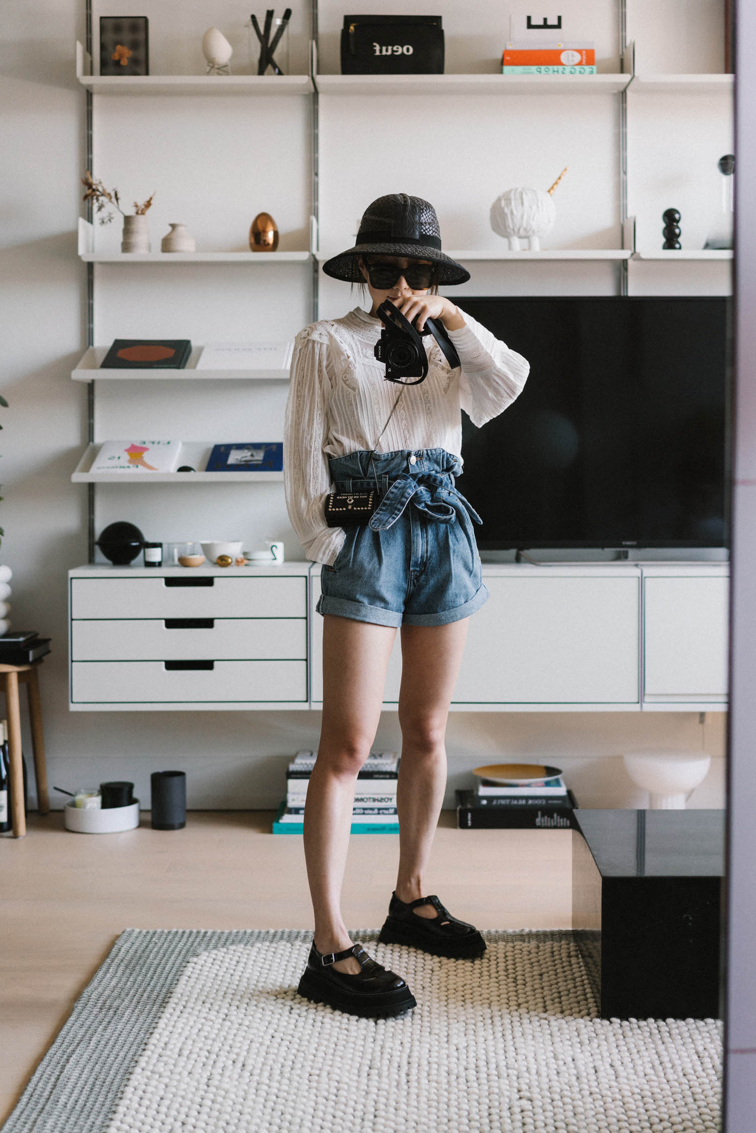 Eye To Eye Top, Issey Miyake Pants, Thelma Loafers, Aspinal of London Bag, Aspinal of London Sunglasses, Janessa Leone Hat