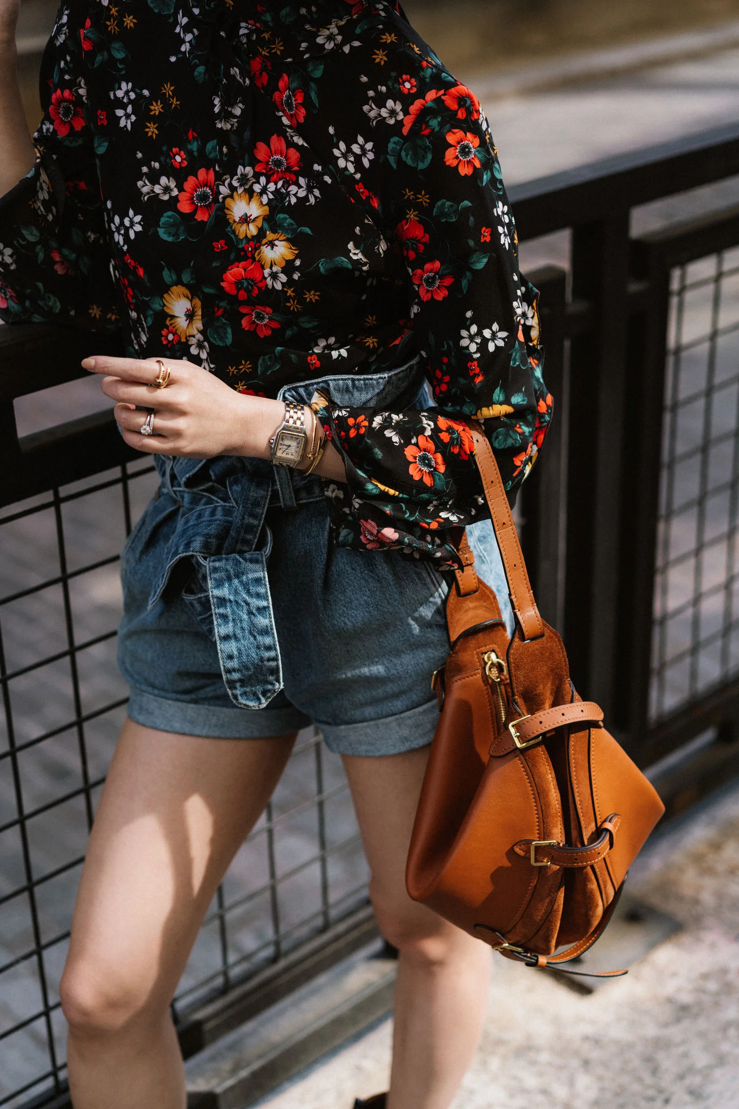 Derek Lam Top, Re/Done + The Attico Shorts, Altuzarra Bag, Cartier Watch, Ring, Bracelets