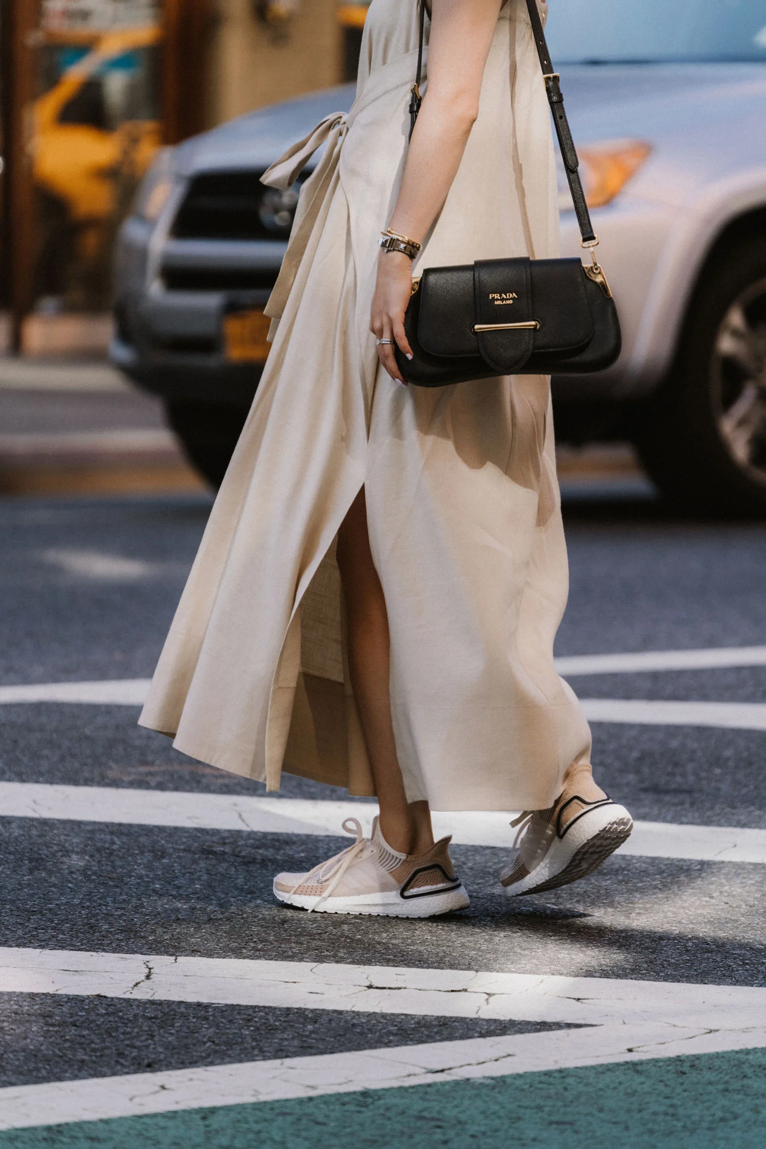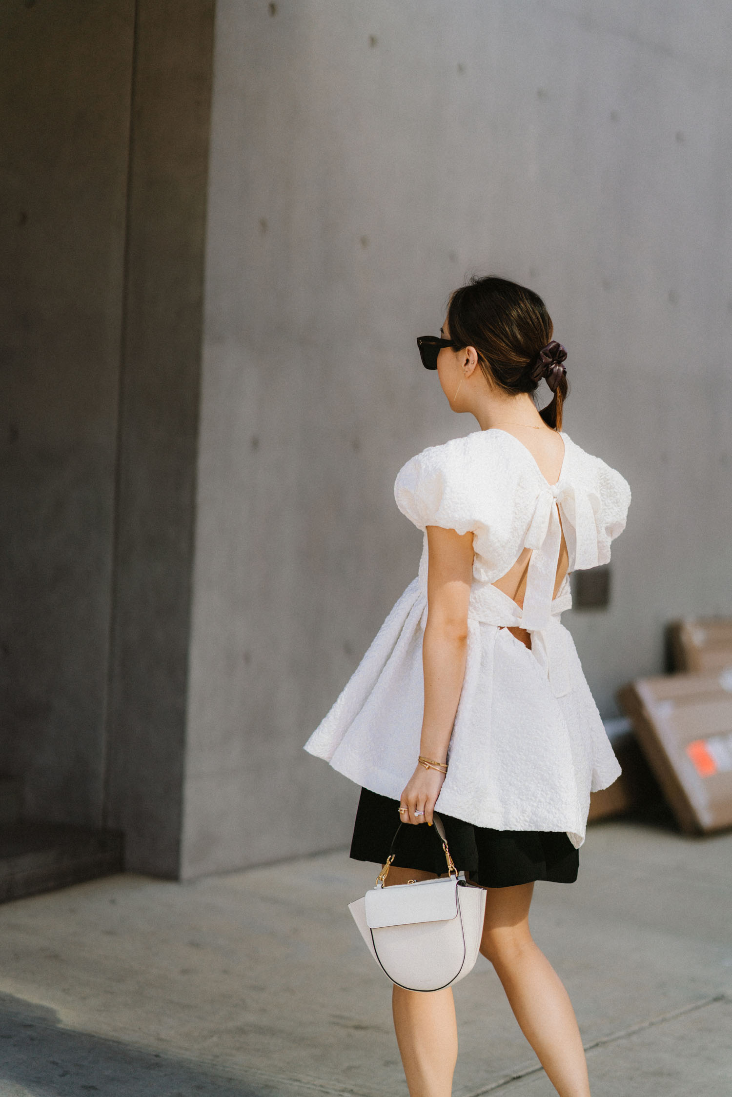 ByTimo Dress, Prada Bag, The Row Shoes, Gucci Sunglasses, Hirotaka Earrings