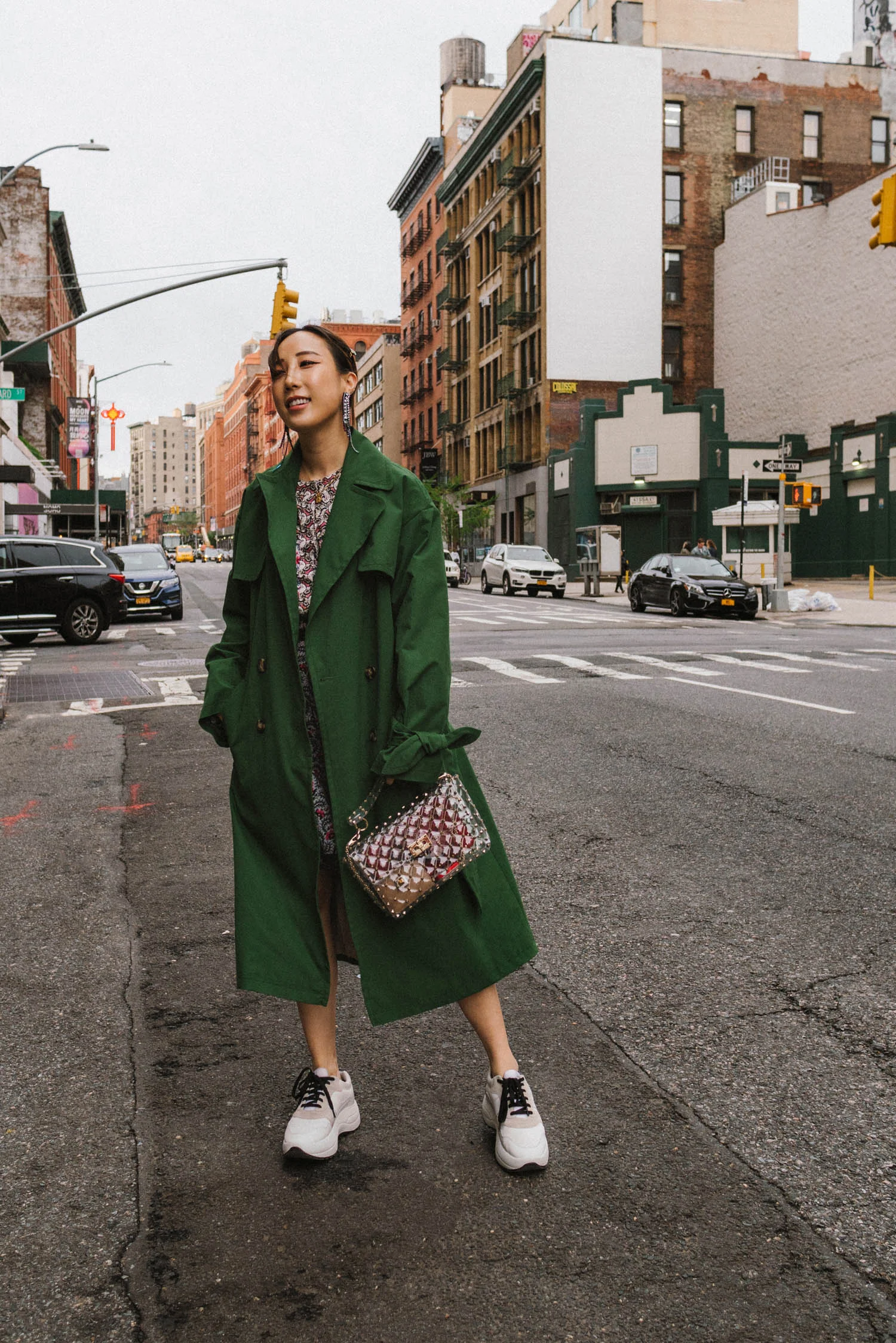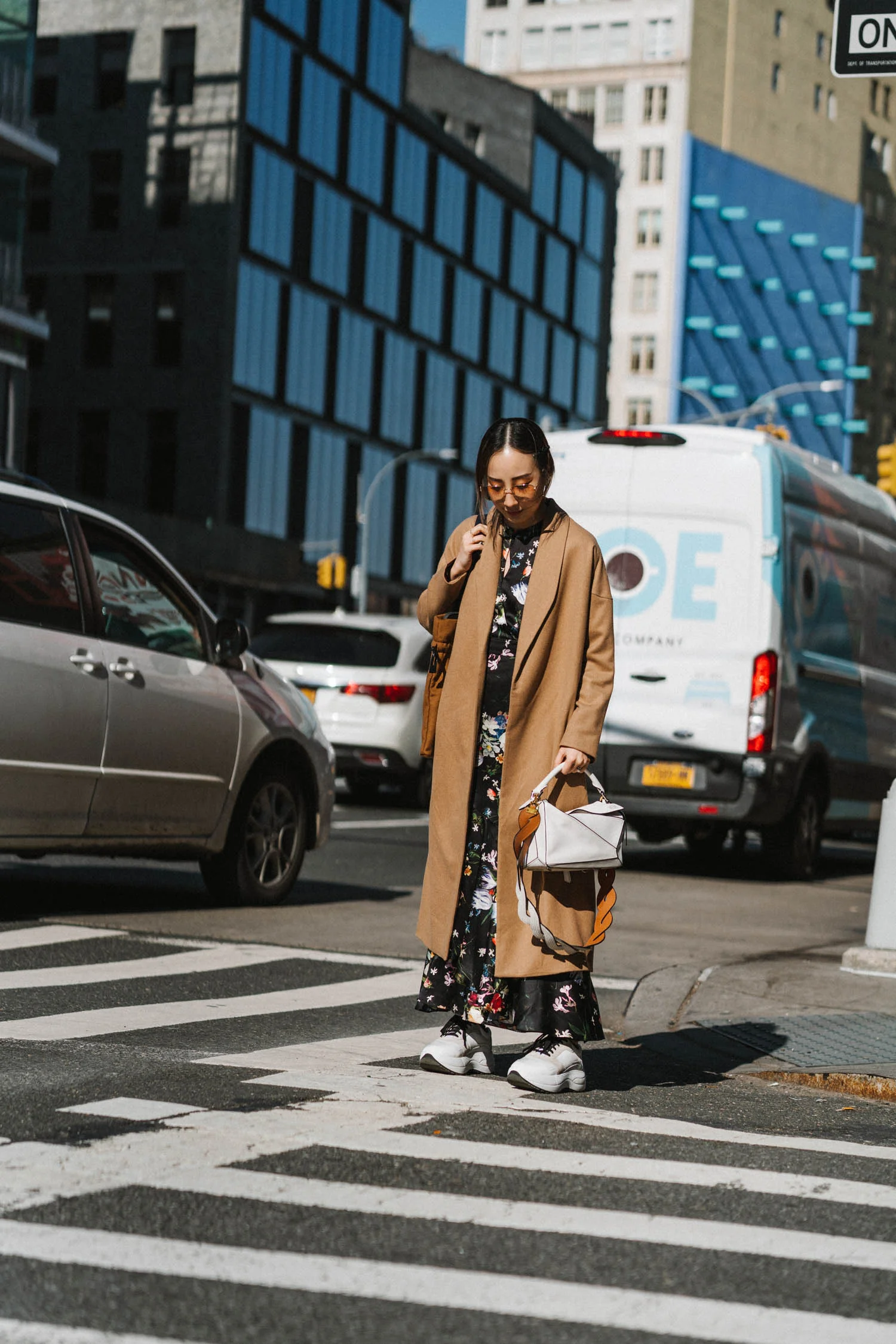 AYR Jacket, Erdem Dress, Loewe Bag, Celine Sneakers, Gucci Sunglasses