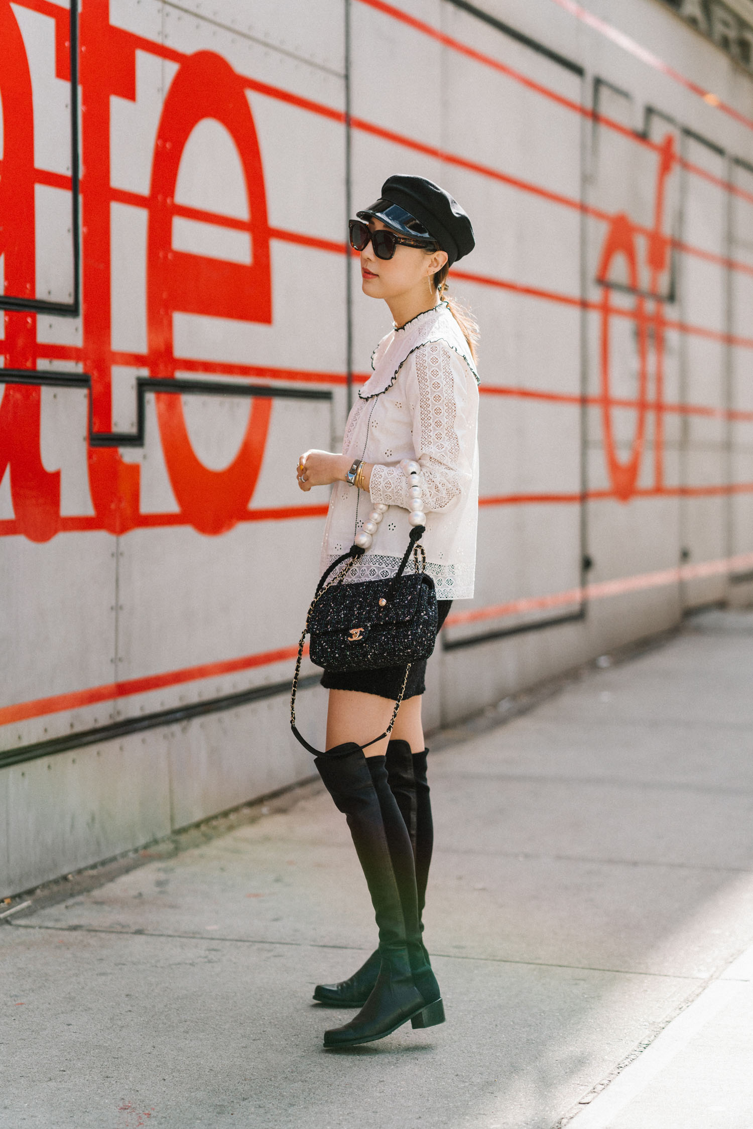 Sézane Top, Alexander Wang Skirt, Stuart Weitzman Boots, CHANEL Bag, Gucci Hat