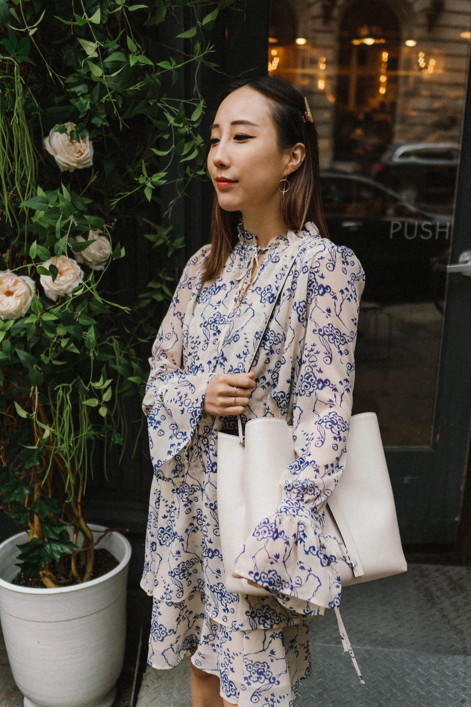 Sézane Dress, Loewe Bag, The Row Shoes, Oliver Peoples Sunglasses