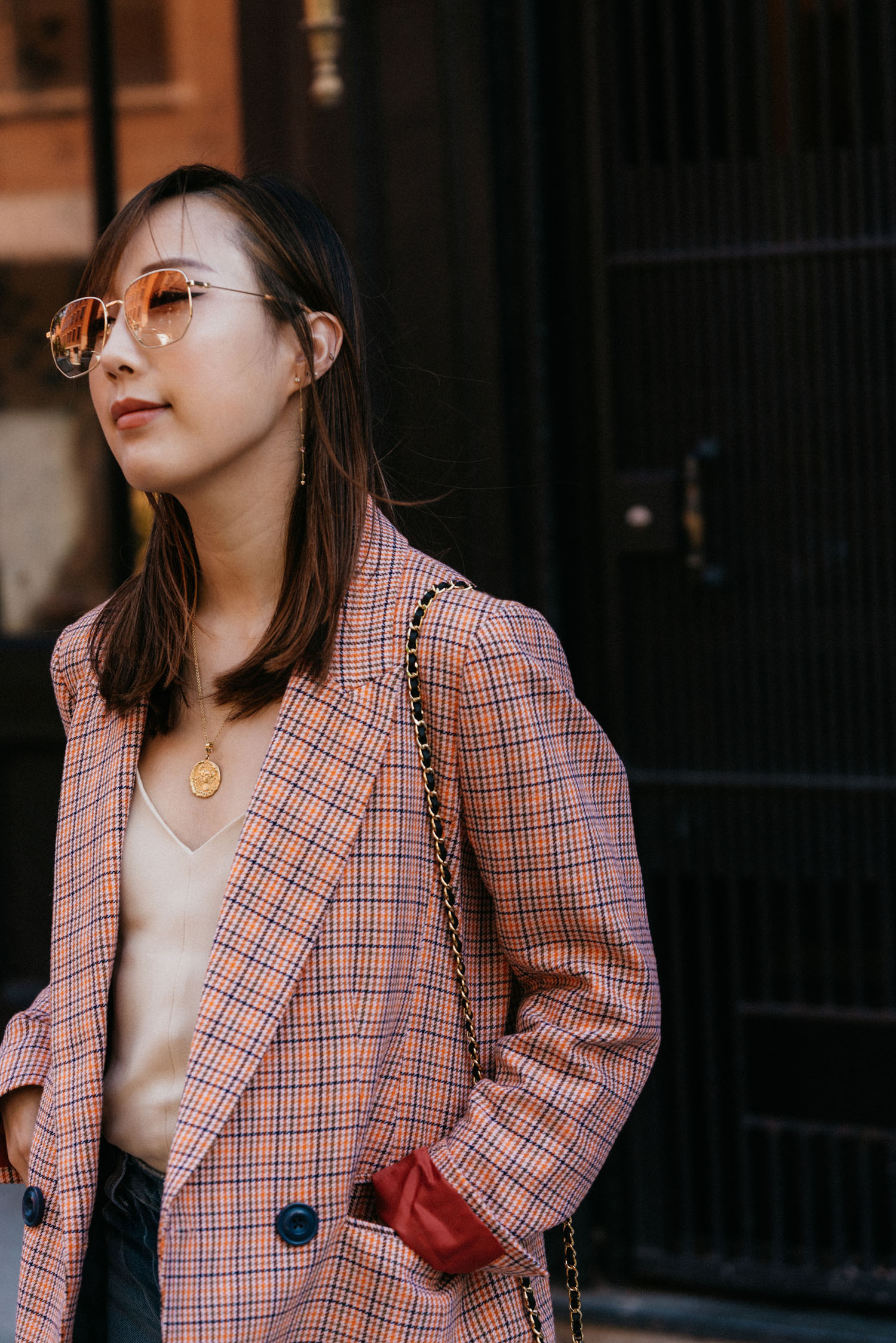 ICONS Objects of Desire Blazer, The Row Top, Trave Denim, Aspinal of London Bag, Gucci Sunglasses, Azlee Necklace, WWAKE Earrings