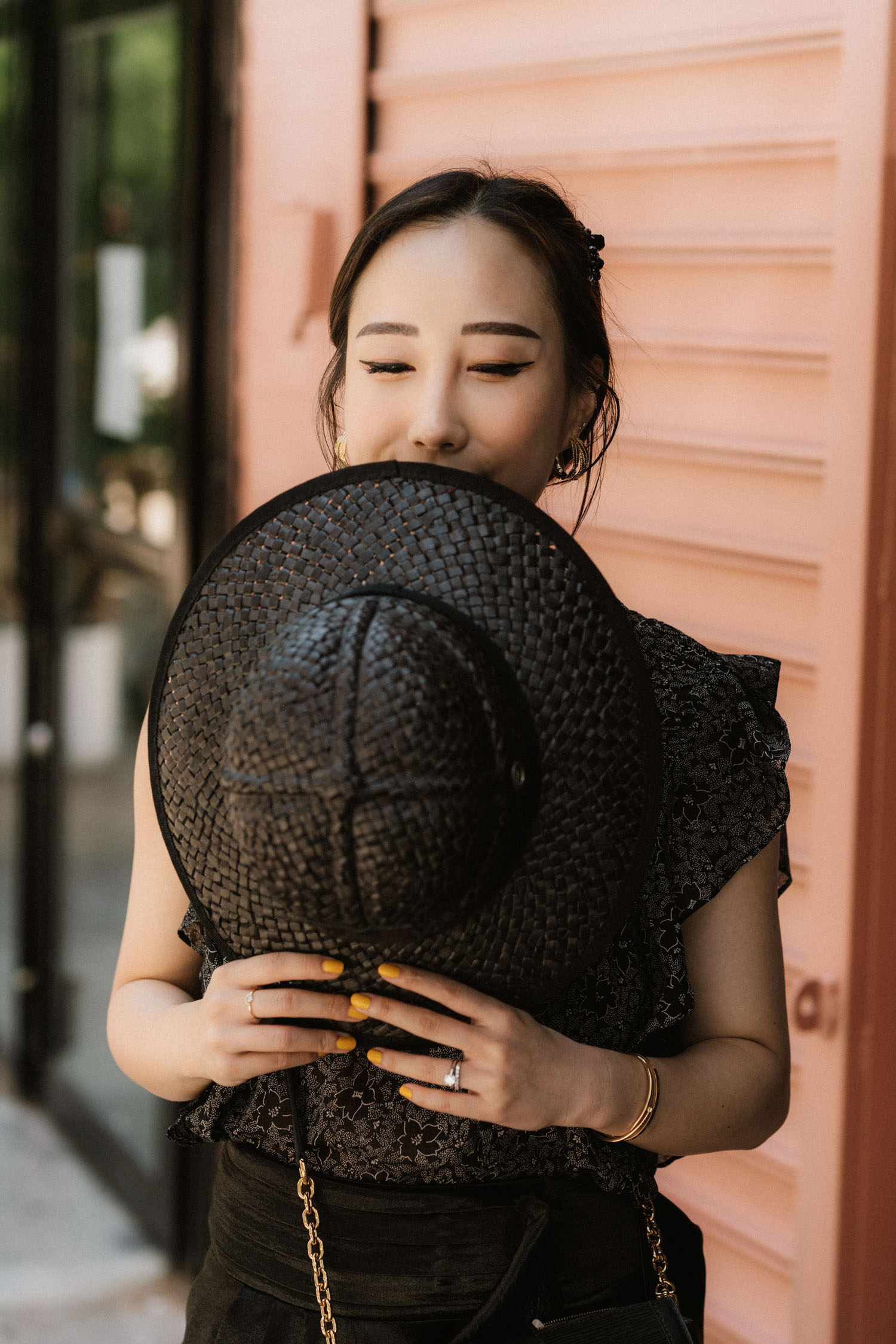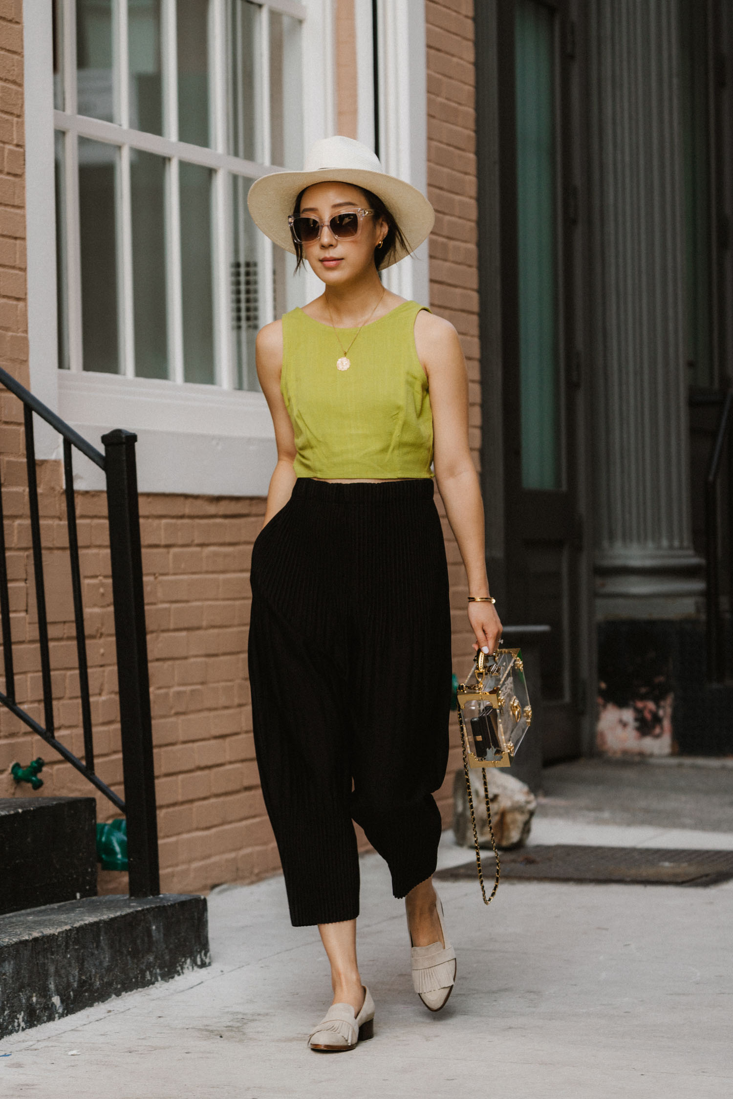 Eye To Eye Top, Issey Miyake Pants, Thelma Loafers, Aspinal of London Bag, Aspinal of London Sunglasses, Janessa Leone Hat
